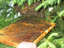 of bees has alighted in a fir tree and is being collected onto a bee-keepers honeycomb.