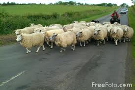 of sheep along a country road.